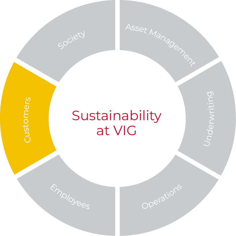 VIG companies serve roughly 33 million customers in 30 countries. The Group relies on a decentralised management approach and local entrepreneurship to satisfy this large diversity of needs and expectations. A centre of competence for customer experience, established in 2023, focuses on aspects such as creating additional benefits for customers and measuring their satisfaction in a standardised manner. Additionally, the VIG insurance companies want to help to close existing protection gaps, particularly with regard to customers. As part of this, they are concentrating on products that target personal resilience and are evaluating product ranges for under-served or socially disadvantaged customers.