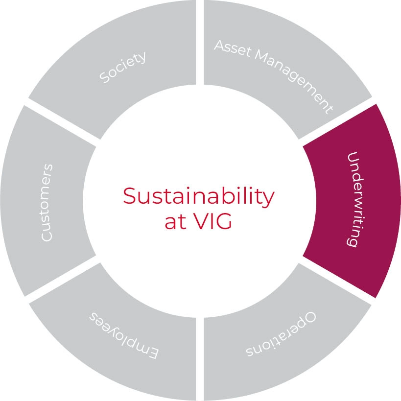 Alongside investment, underwriting as a core activity for insurers is a key lever for contributing to a sustainable future. The Group's long-term objective is to reduce greenhouse gas emissions from the corporate underwriting portfolio to net zero by 2050. For this reason, the insurance group has started to measure its scope 3 emissions and is constantly working to improve the quality of its data. This data forms the basis for measuring VIG's progress in the spheres of impact underwriting. VIG also wants to help its customers better adapt to climate change and increase the proportion of products and services that are helpful in this regard.